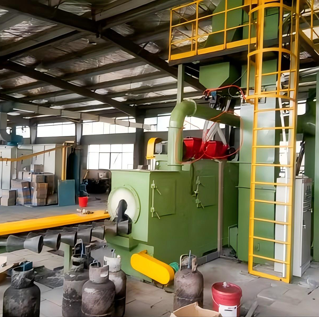The cylinders can be automatically loaded and unloaded onto the shot blasting machine and the painting line conveyor chain using a simple automatic leveling device developed and produced by us.